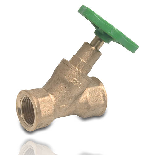 | - Anschluss: Innengewinde - Werkstoff: Messing - Bedienung: Handard - Material Hebel/Griff: Polyamid - Griff-Farbe: Grün - Material (Klappe): Messing - Material Dichtung: EPDM - Max. Temp.: 90°C - Oberteil mit steigender Spindel |